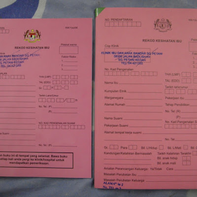 Di nasihatkan agar ibu-ibu yang nak ke klinik , kalau boleh hubungi dulu klinik kesihatan tersebut untuk kita tahu apakah keperluan atau dokumen yang perlu dibawa semasa mendaftar.Dari pengalaman kak su , semasa pendaftaran mereka memerlukan sijl nikah.Sijil nikah ni wajib kalau kandungan tu anak sulung.Satu lagi, ibu-ibu kenalah ingat tarikh terakhir datang haid.Jangan main teka-teka je tau.Tarikh akhir tu digunakan untuk menganggar tarikh bersalin.Apabila siap mendaftar ibu-ibu akan diberi buku berwarna merah.Akak panggil "buku merah".Nurse akan mencatatkan semua sejarah silam keluarga seperti sakit kronik, pernah ada kelahiran pramatang dan sebagainya.